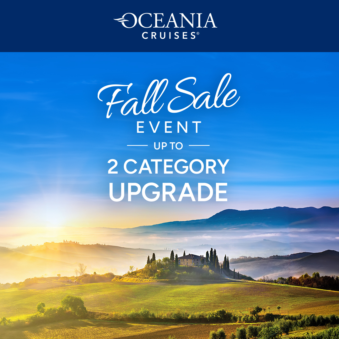 *Offers, fares and itineraries are accurate as of September 17, 2025 and subject to change or withdrawal without prior notice. Upgrade Sale is valid 09/17/25-11/18/25. Up to 2 Category Upgrade is available for select categories on select sailings, subject to change and capacity controlled. Number of categories upgraded varies based on cruise and category booked. Mention Code UG. For Your World Included amenities, guests in the same stateroom must choose the same amenity. Choice of amenity must be made by final payment and is not applicable to 3rd and 4th guests. Amenity choices are (1) Complimentary Wine & Beer or (2) Shore Excursion Credit. If no amenity is chosen, a non-use credit will be applied to final payment: for sailings up to 9 days receive US$200 credit per stateroom; 10-13 days receive US$300 credit per stateroom; 14-19 days receive US$400 credit per stateroom; 20-25 days receive US$500 credit per stateroom; 26+ days receive US$600 credit per stateroom. Complimentary Wine & Beer includes a selection of wine by the glass or beer from our General Bar Menu, available at any onboard venue as well as through room service during operating lunch and dinner hours. Certain exclusions apply. If Shore Excursion Credit is selected, all excursions must be chosen at least 14 days prior to sailing. Value of shore excursion credits varies by voyage length and is per stateroom except for a single traveler booked in a Solo category or booked with a single supplement discount, where amenity is per guest. Voyages (1) up to 9 days receive shore excursion credit of US $400; (2) from 10-13 days receive US $600; (3) from 14-19 days receive US $800; (4) from 20-25 days receive US $1,000; and (5) greater than 26 days receive US $1,200. Any unused shore excursion credit can be used as shipboard credit on the same voyage or will be surrendered upon debarkation. For more details about Best Value Guarantee, visit OceaniaCruises.com/legal. All fares are per person in U.S. dollars, valid for residents of United States and Canada, based on double occupancy (unless otherwise noted) – except fares for Solo category are for a single traveler and are based on single occupancy – for new bookings only and may be withdrawn at any time. Unlimited WiFi amenity does not include streaming and includes a login for the first two devices per stateroom (one login for solo traveler). Visit OceaniaCruises.com/internet for more details. Fares are based on published Full/Brochure Fares; such fares do not include optional charges as detailed in the Guest Ticket Contract, which may be viewed, along with additional terms, at www.OceaniaCruises.com. All cruise fares include gratuities for stateroom/suite attendants, butlers and dining waitstaff, as well as government taxes and fees. For other services or purchases made onboard, additional gratuities of 20% apply. Not all promotions are combinable. We may collect, use, share and secure your personal data as described in our privacy policy, which is available on our website at www.OceaniaCruises.com/legal/privacy-policy. Oceania Cruises reserves the right to correct errors or omissions and to change any and all fares, fees, promotions and surcharges at any time. Ships’ Registry: Marshall Islands.